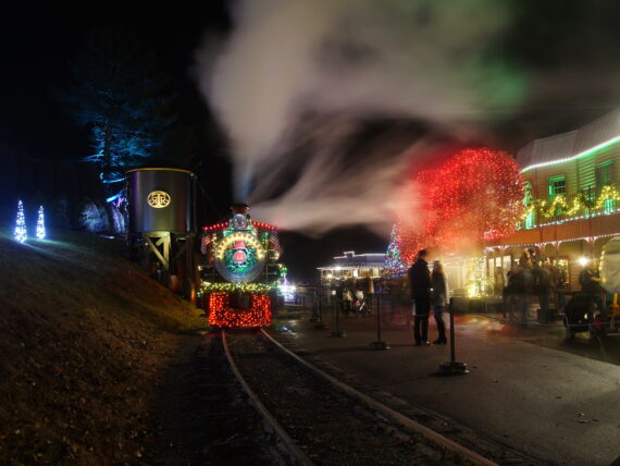 Holiday activities the whole family will love, featuring a nighttime train ride behind a historic steam locomotive on a three-mile route lined with thousands of Christmas lights, a heartwarming, toe-tapping, live Christmas variety show, kid-friendly amusement rides, meetings with Santa in his Gingerbread House filled with candied furnishings, and roasting s’mores over an outdoor fire.